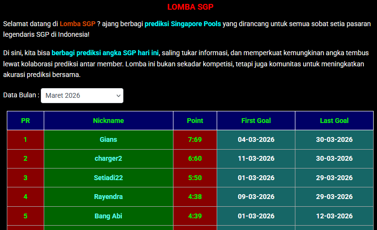 Di sini, kita bisa berbagi prediksi angka SGP hari ini, saling tukar informasi, dan memperkuat kemungkinan angka tembus lewat kolaborasi prediksi antar member. Lomba ini bukan sekadar kompetisi, tetapi juga komunitas untuk meningkatkan akurasi prediksi bersama.
